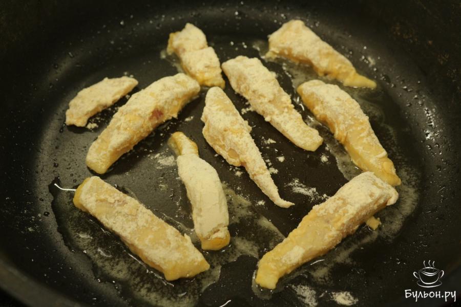 4. Теперь, уже нарезанную рыбку кладем в начале в миску с жидкой панировкой и обмакиваем ее со всех сторон, затем в емкость с сухой панировкой. Также обваливаем кусочки рыбы с другой стороны.