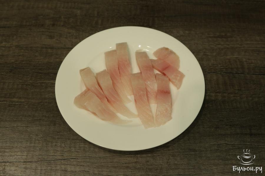 2. Займемся рыбой. Ее вымоем, просушим любым способом и нарежем с помощью ножа на продолговатые брусочки шириной примерно 1 см.