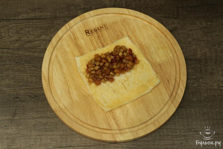 5. Как только яблоки стали мягенькими, всыпаем корицу и снова перемешиваем все, что содержится в сковороде. Как только перемешали и поготовили все вместе еще 1 минуту, отставляем сковороду с огня, начинку перекладываем, чтобы она немного остыла.