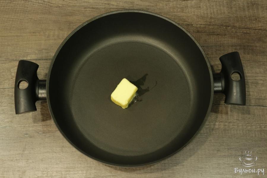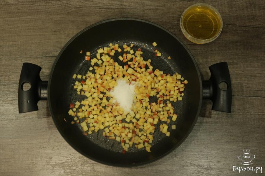 3. На сковороде топим кусочек масла. Огонь должен быть средним. После чего выкладываем на него яблочки и жарим, постоянно помешивая, минуты 4.