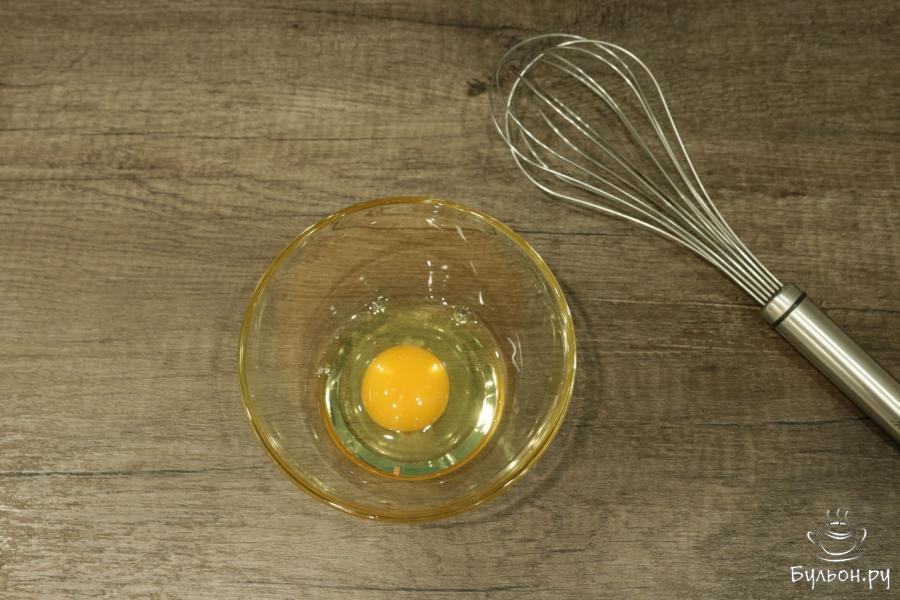 8. Берем яйцо, разбиваем его в емкость и слегка взбиваем. Все квадратики хлеба сверху промазываем небольшим количеством взбитого яйца, оставив только центр без него.