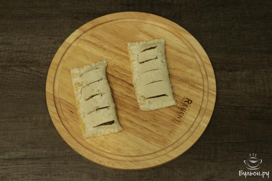 10. Закрываем пирожок, вилкой придавливаем края с трех сторон, после чего отрезаем острым ножом все неровности. Готовим оставшиеся четыре пирожка.