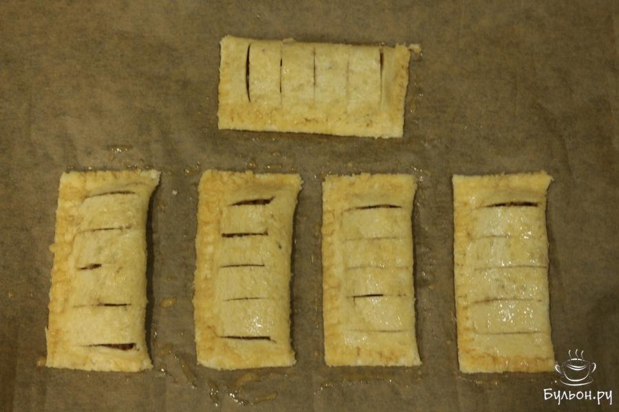11. Противень застелем пекарской бумагой, на которую выложим пирожки. Смажем их обильно взбитым яйцом и отправим в духовку на 15 минут. Духовка должна быть разогрета до 190 градусов по Цельсию.
