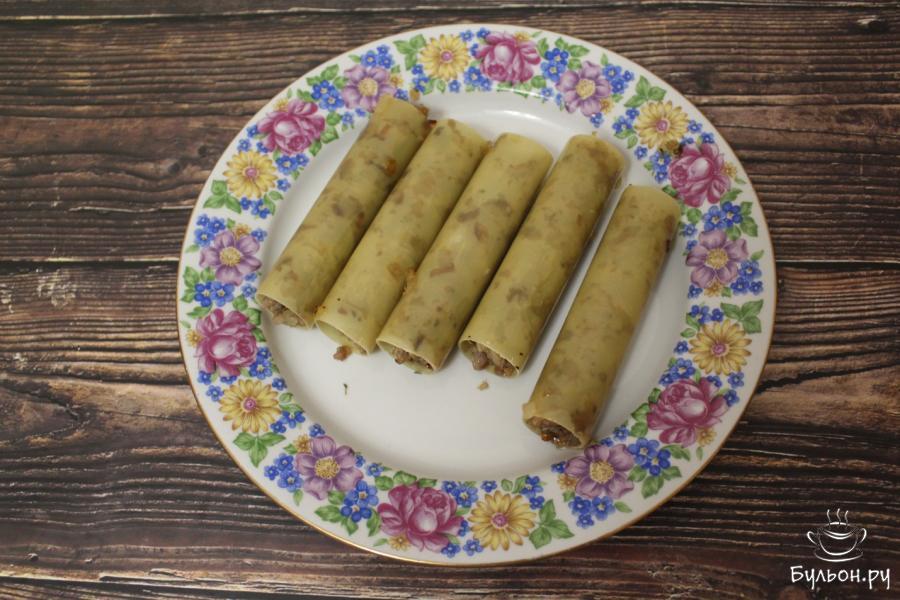 4. Макаронные трубочки очень плотно наполняем фаршем. Свободного места и пустот внутри каннеллони быть не должно.