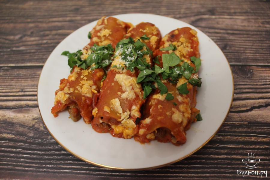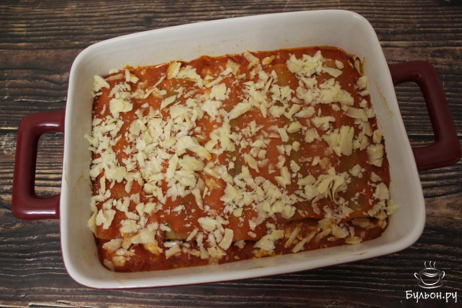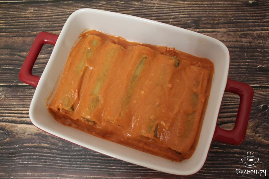 5. Начиненные трубочки выкладываем в форму для запекания, заливаем соусом. Саму форму закрываем сверху фольгой и в течение получаса запекаем каннеллони в духовки при 180 градусах.