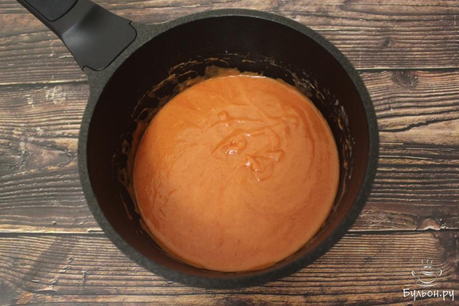 3. Приготовим томатный соус. В растопленном сливочном масле обжариваем муку, заливаем зажаренную муку молоком и готовим соус так, чтобы он стал густым, но в то же время текучим. В этот момент добавляем томатную пасту и соль, вымешиваем и снимаем соус с огня.