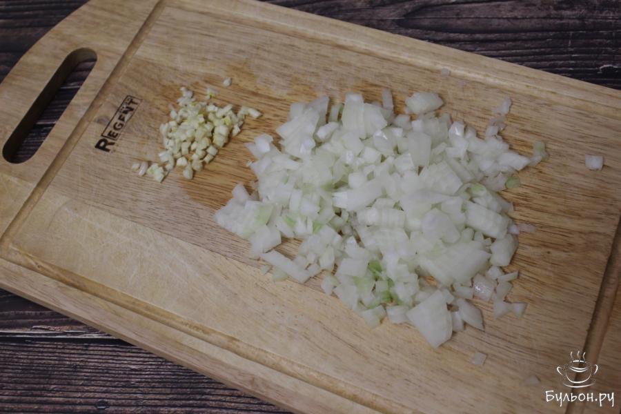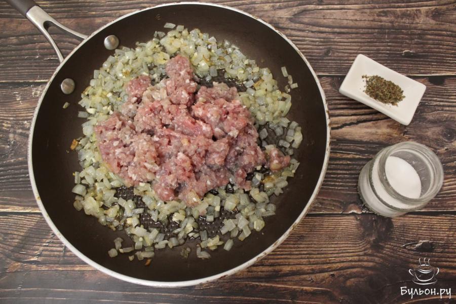 2. Переложим лучок в сковороду и обжарим, чтобы образовалась легкая золотистая корочка. Затем добавим чесночок и продолжим еще немного обжаривать, буквально 2-3 минутки. Добавляем фарш, приправляем прованскими травами и солью. Тушим до испарения жидкости, после чего еще слегка обжариваем.