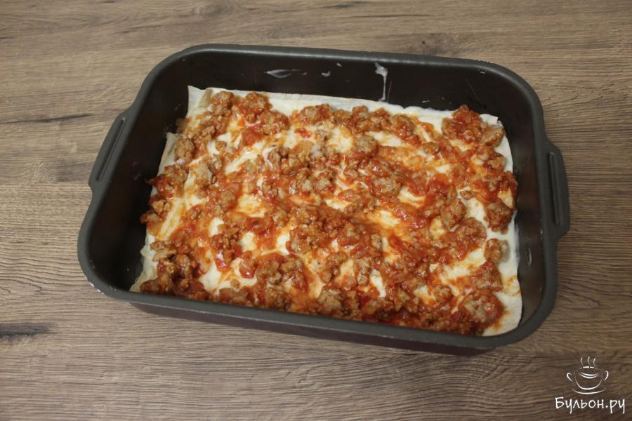 5. Дно формы смажьте растительным маслом и выложите 2 слоя лаваша, равные форме запекания. Смажьте его белым теплым соусом. Поверх выложите мясную начинку.