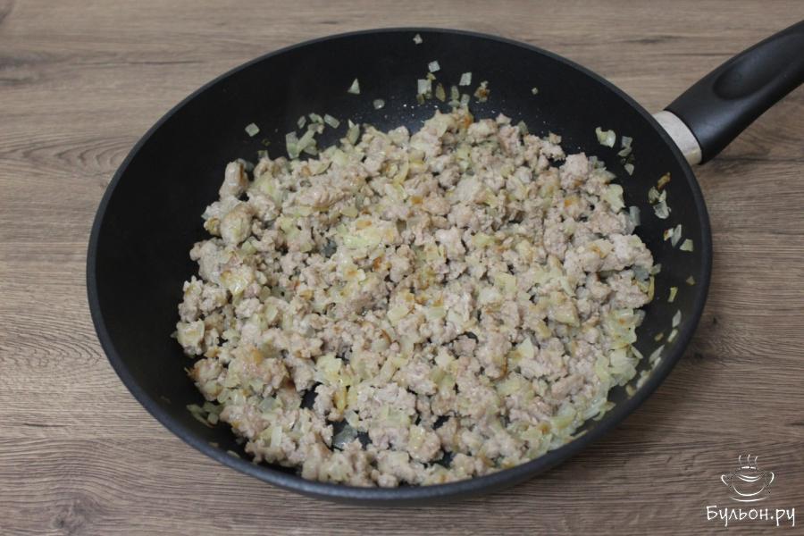 1. Очищенный лучок нарежьте кубиками и слегка обжарьте на рафинированном масле в большой глубокой сковороде. После чего выложите к луку фарш и готовьте до полного выпаривания влаги.