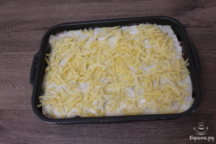6. Затем снова выложите лаваш, белый соус, мясную начинку и чередуйте так, пока продукты не закончатся. Завершаться лазанья должна лавашом, смазанным белым соусом, а сверху она должна быть присыпана крупно натертым сыром.