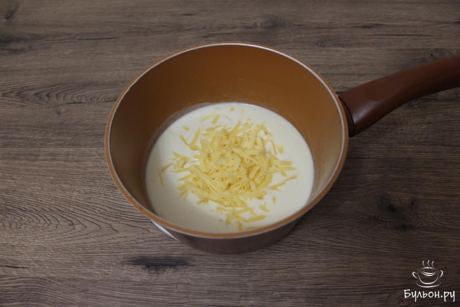 4. В ковшичке на растопленном сливочном масле обжарьте пшеничную муку. Затем влейте молоко и держите соус на плите до тех пор, пока он не загустеет. При этом обязательно соус мешайте, это позволит избежать комков. В готовый соус отправьте 50 граммов крупно натертого сыра и приправьте мускатным орехом.