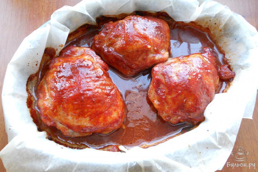 6. Духовку разогреть до 180 градусов. Запекать бедрышки в течение часа, через каждые 15 минут поливая их соусом.