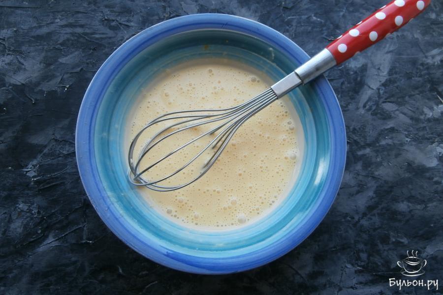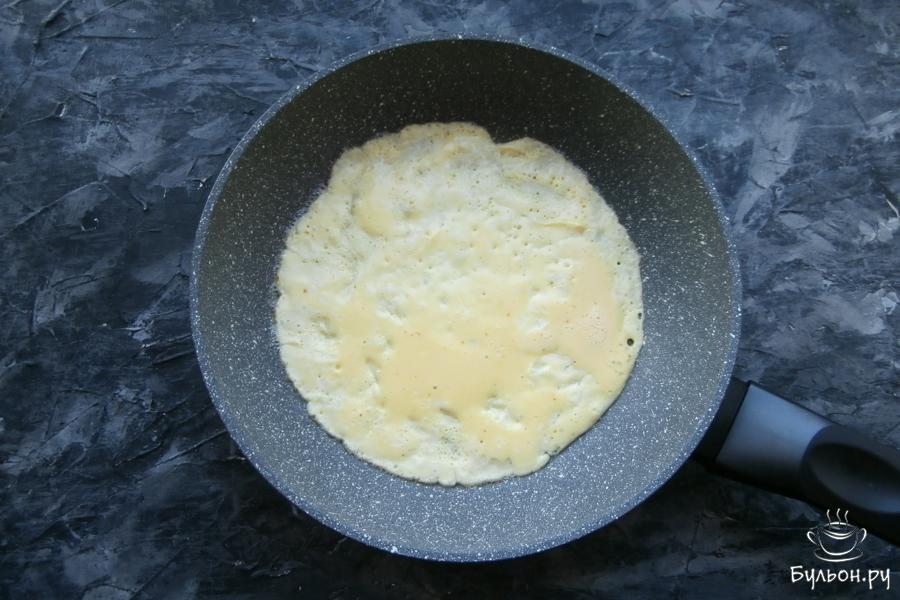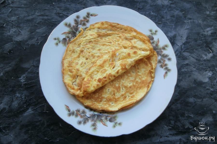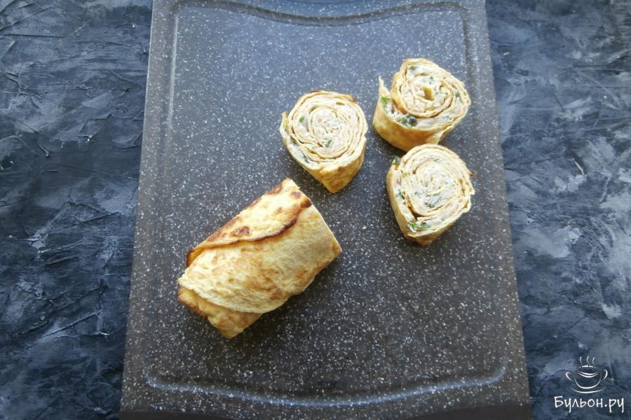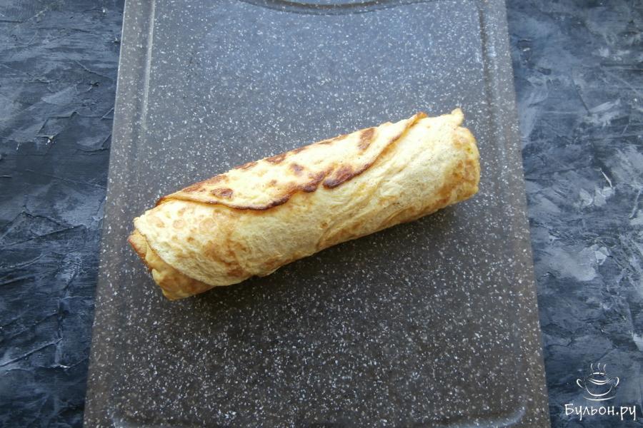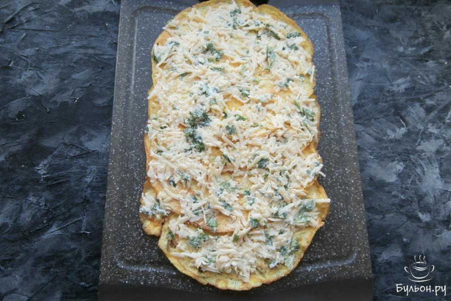 7. Блинчики выложить внахлест, чтобы получился продолговатый пласт. Смазать блинчики сырной смесью, распределив ее по всему пласту.