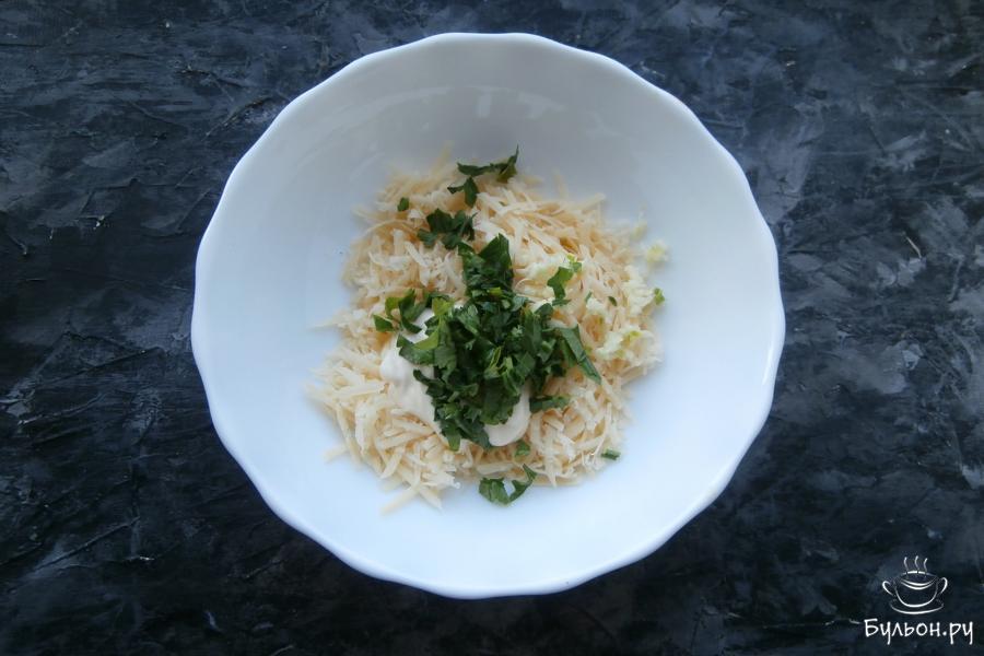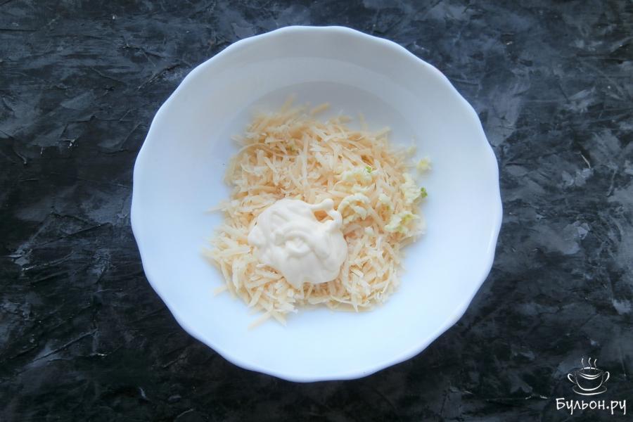 5. Сыр хорошего качества натереть (желательно на мелкой терке), добавить оставшийся майонез и измельченный чеснок.