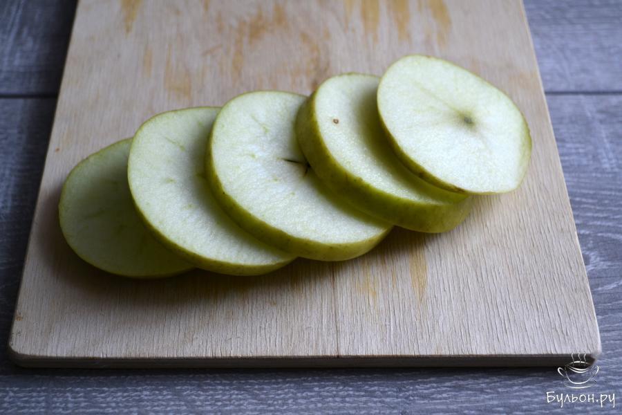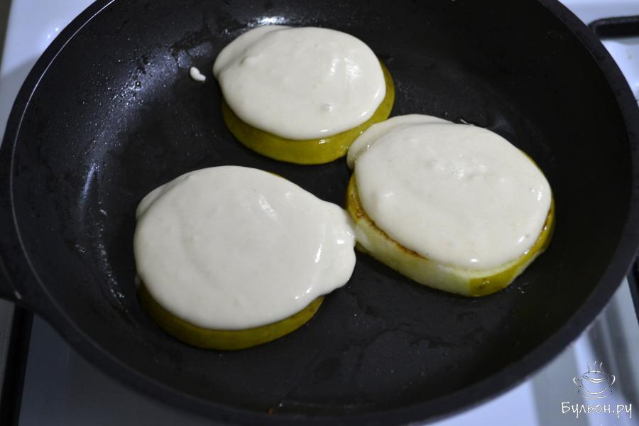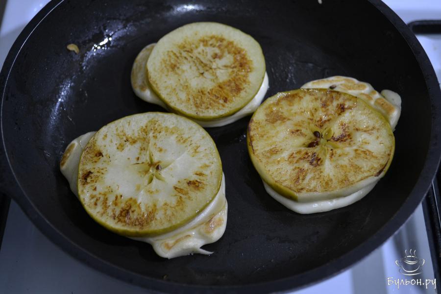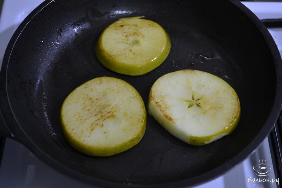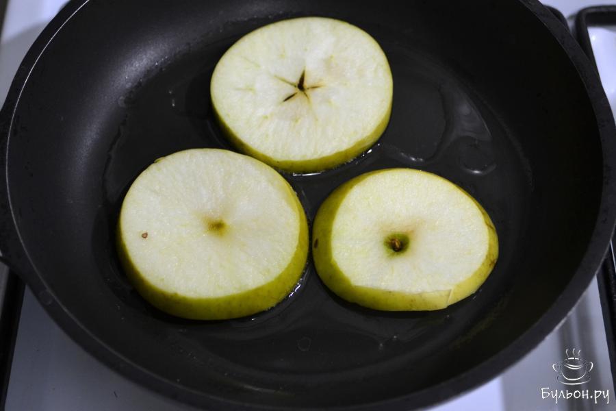 5. Разогрейте сковороду с маслом и положите кружочки яблок. На среднем огне обжарьте яблоки в течение 2-3 минут.