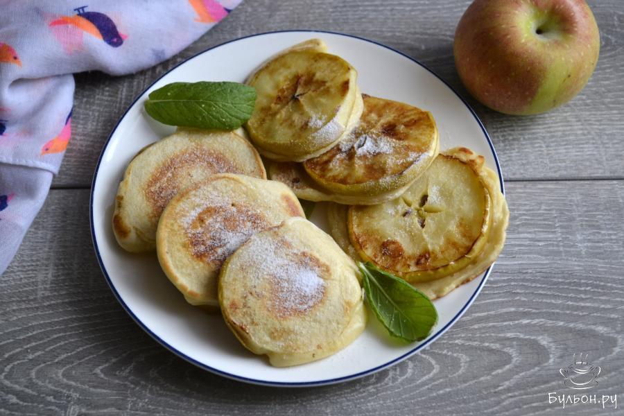 Обычно, для приготовления яблочных оладушек, яблоки натирают на крупной терке и добавляют в тесто. Если вам по вкусу яблочные оладьи, попробуйте приготовить яблоки в тесте на сковороде по этому рецепту. Сначала яблоки нужно нарезать кружочками и слегка обжарить на масле. В итоге получится красивое по подаче и вкусное блюдо: кружочки обжаренных яблок в мягком тесте. Оладушки можно посыпать сахарной пудрой или добавить в тесто щепотку корицы, она очень хорошо сочетается по вкусу с яблоками.