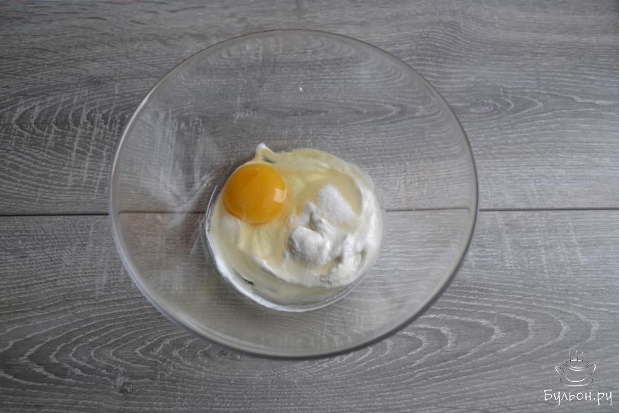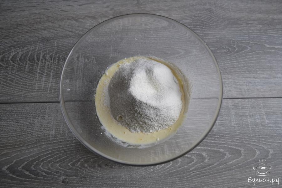 2. Всыпьте просеянную муку и разрыхлитель. Количество муки может немного отличаться от указанного в рецептуре и зависит от категории яйца и густоты сметаны.
