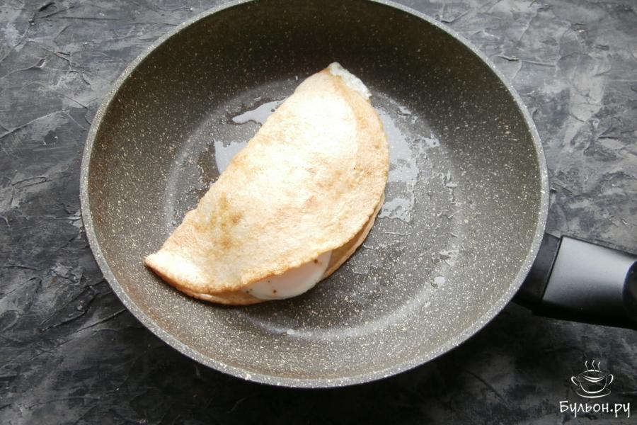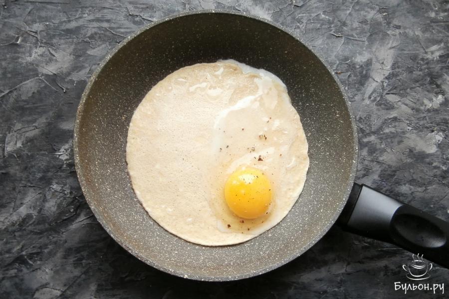 6. Аккуратно сложить блин вдвое, т. е. яйцо на одной половине блина накрыть другой половиной. Сковороду прикрыть крышкой и жарить блин, также, на медленном огне 2-4 минуты (время зависит от того, какой желток вы хотите получить в итоге).