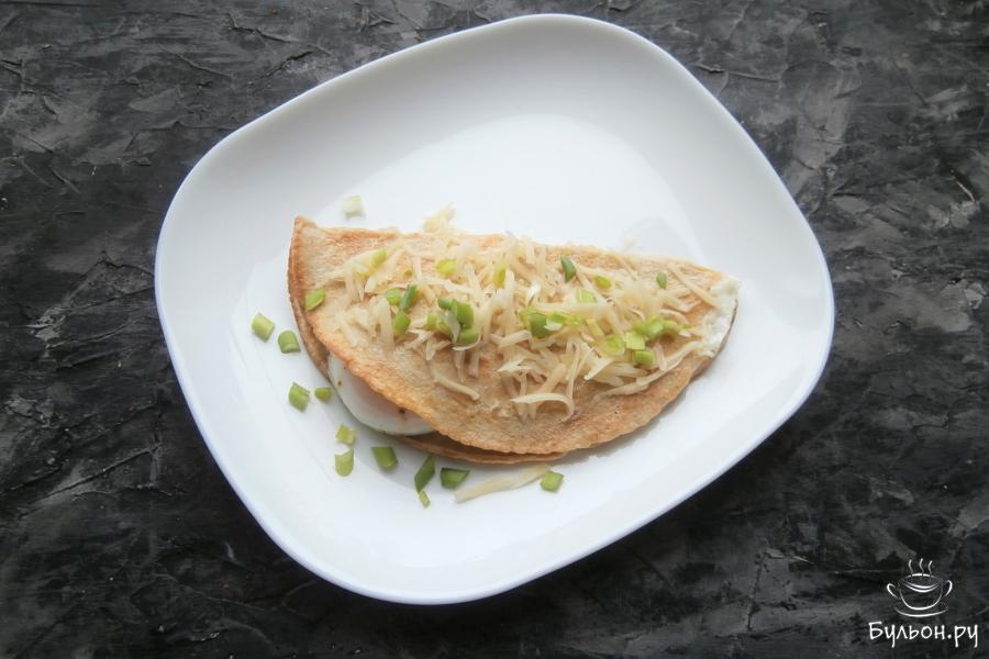 7. Газ выключить, а овсяноблин оставить в сковороде под крышкой еще на пару минут, затем, переложить его на тарелку, посыпать тертым сыром и измельченным зеленым луком.