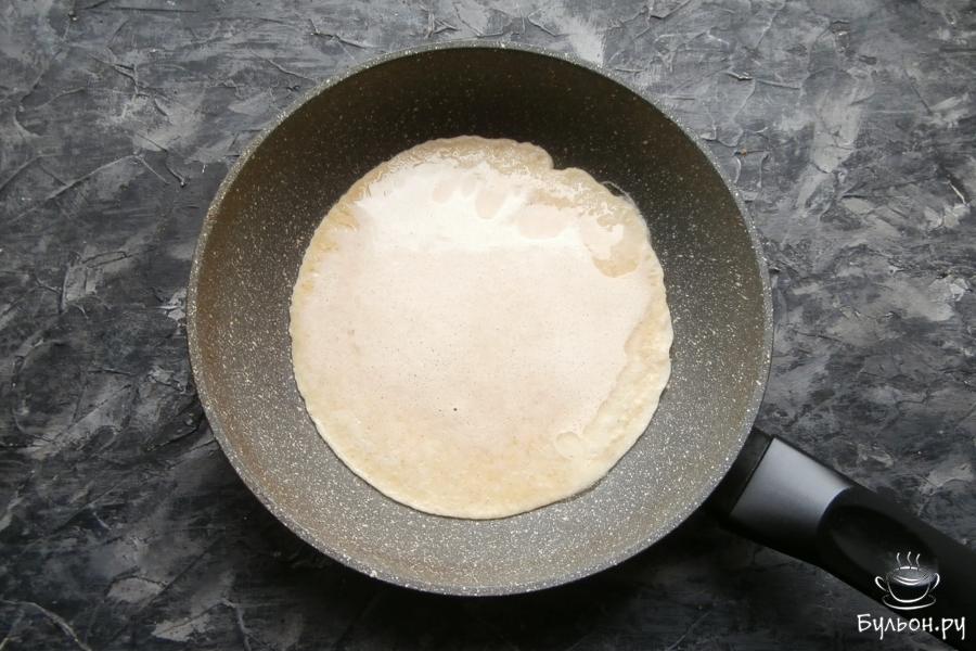 4. Растительное (любое) масло разогреть в сковороде, вылить овсяную смесь, накрыть крышкой. Готовить блин на небольшом огне около 2-3 мин., пока верх блина подсохнет.