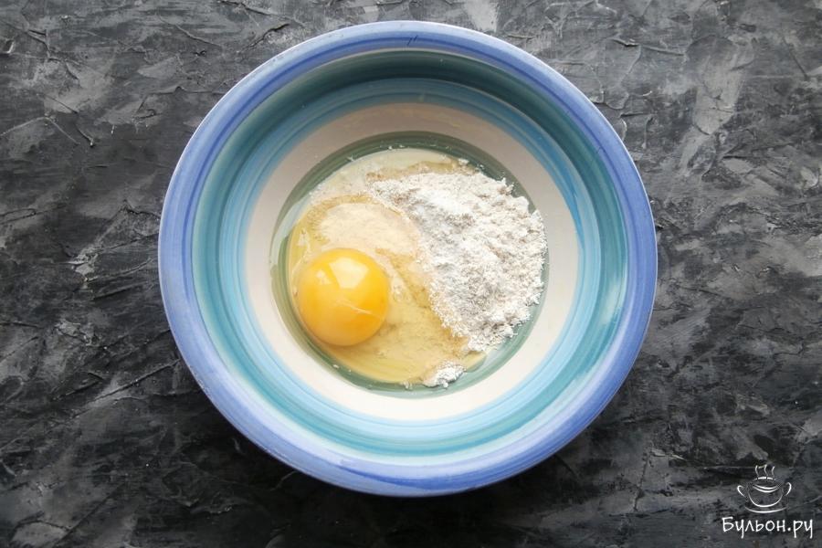 1. 2 ст. ложки овсяных хлопьев смолоть в кофемолке в муку, пересыпать в миску, добавить 1 сырое яйцо.