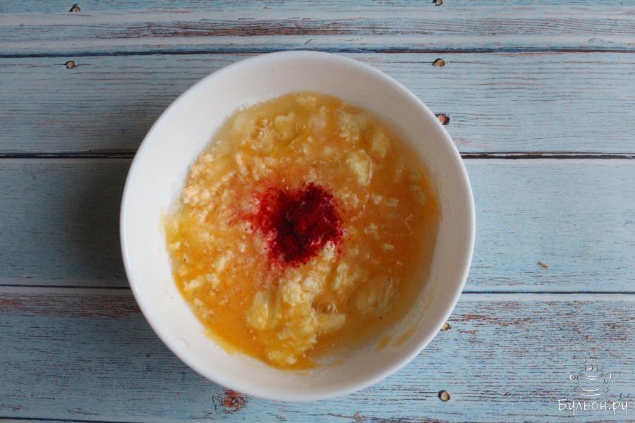 4. Добавляем в масляную смесь пищевой краситель. Цвет красителя выбираем по желанию, я добавила сухой розовый краситель. Хорошо перемешиваем смесь до полного растворения сахара.
