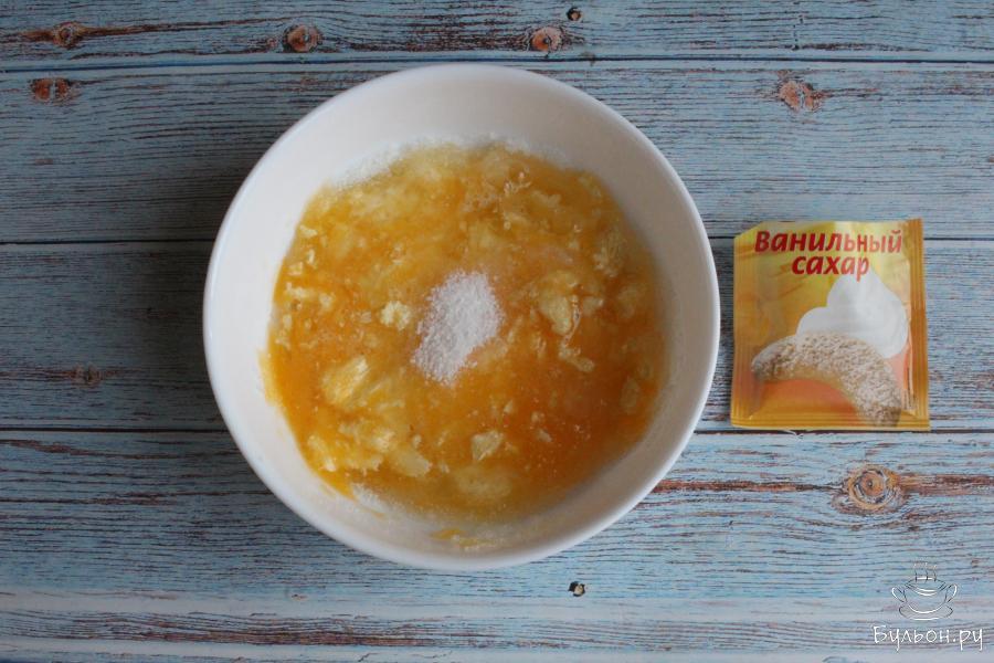 3. Добавляем в масляную смесь ванильный сахар. Перемешиваем. Если у вас нет под рукой ванильного сахара, то можно заменить его на ванилин.