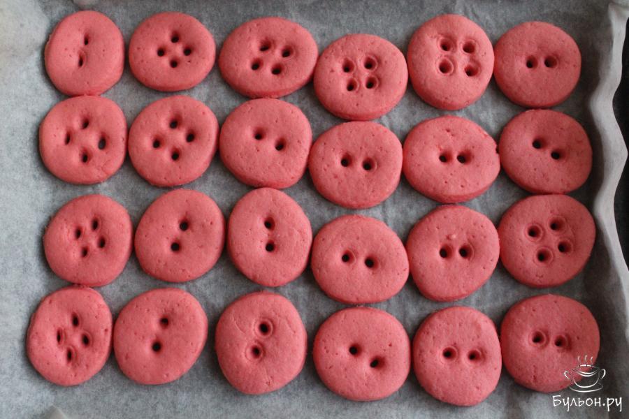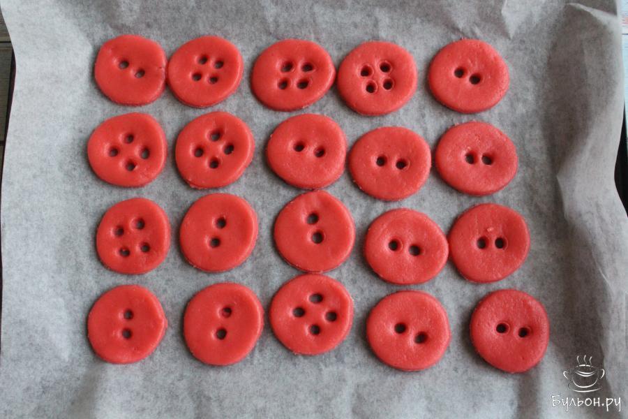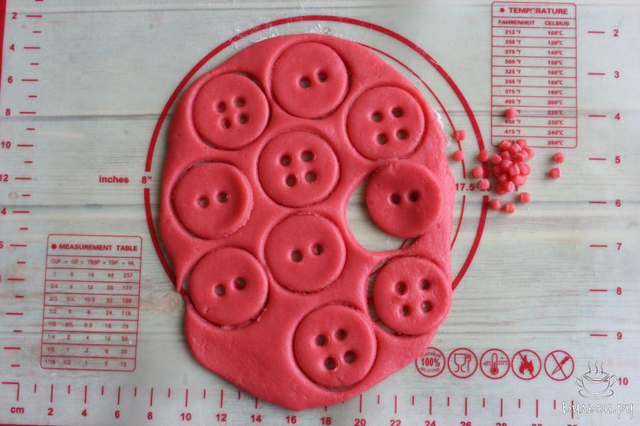 6. Сразу начинаем разделывать тесто. Раскатываем пласт толщиной около 0,5 см и вырезаем круглые печеньки-пуговицы. В каждом печенье делаем две или четыре дырочки, чтобы печенье стало похоже на пуговицы. Размер печенья делаем на свое усмотрение.