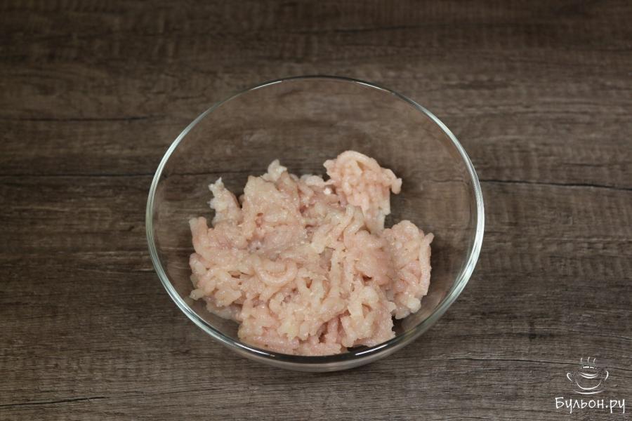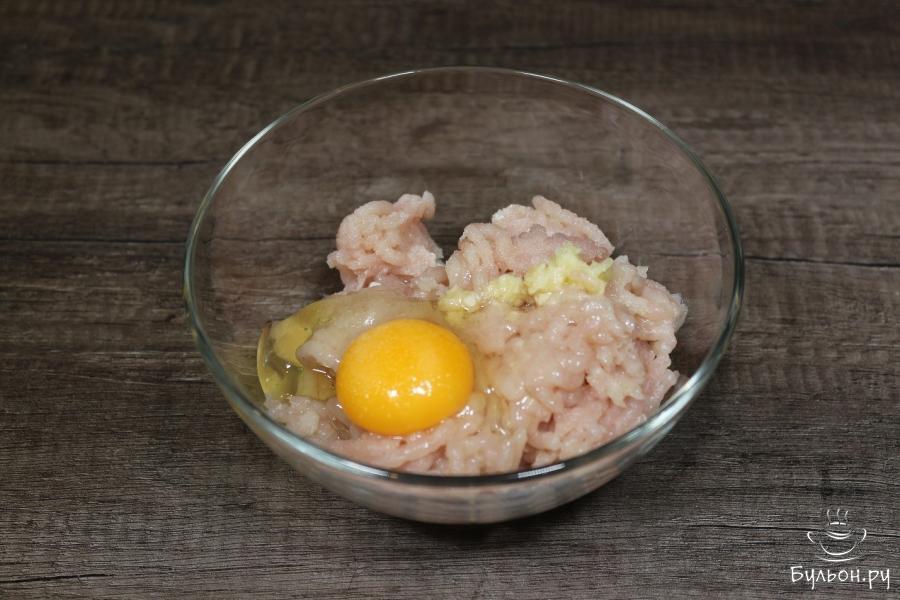 4. Кладем индейку с луком в миску. Также в нее добавляем измельченный чеснок, вбиваем маленькое яйцо и всыпаем соль. Все ингредиенты хорошо перемешиваем. Соль добавляем по вкусу и при необходимости добавляем еще.