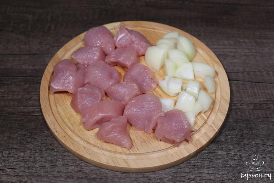 1. Филе индейки хорошо промоем под холодной водой. Затем бумажными полотенцами или при помощи салфеток обсушиваем мясо. Нарезаем индейку на средние куски. Репчатый лук также нарежем средними кусками.