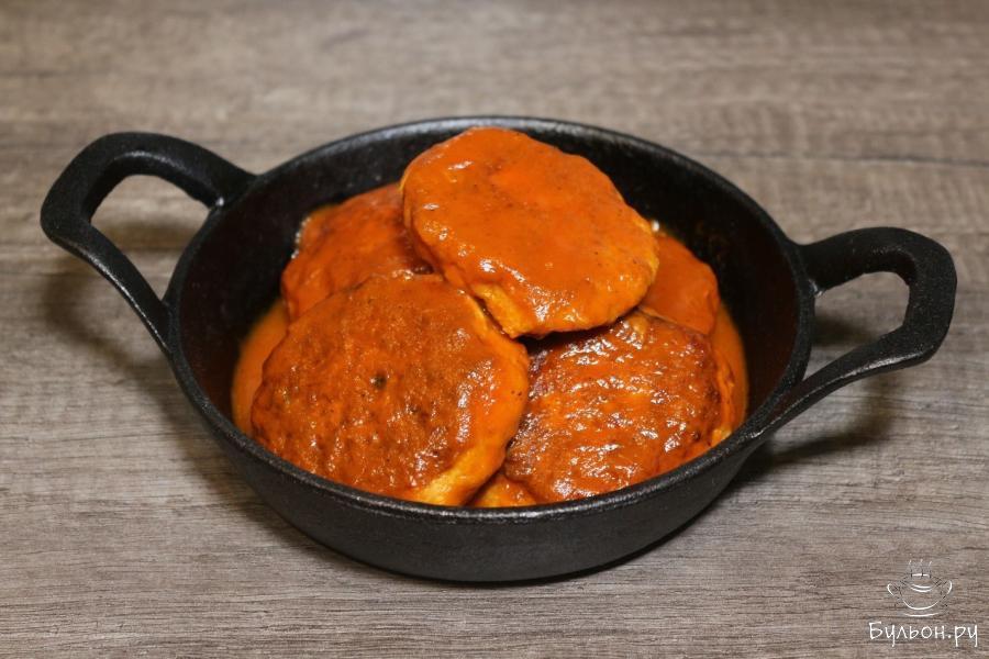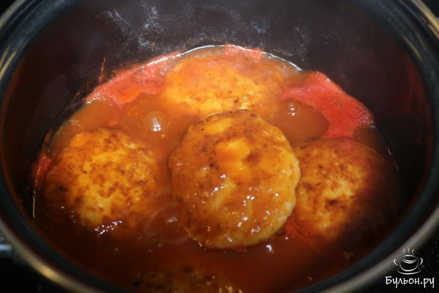 8. Получившуюся смесь вливаем в кастрюлю, доводим до кипения. Затем выкладываем в кастрюлю биточки и накрываем крышкой. Тушим их так 20 минут.