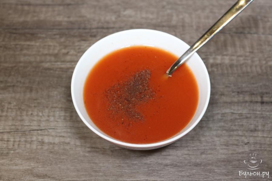 7. Кипятим воду. В миске или в большой кружке смешиваем следующие ингредиенты: кипяток, томатную пасту, сахар, перец черный, соль.