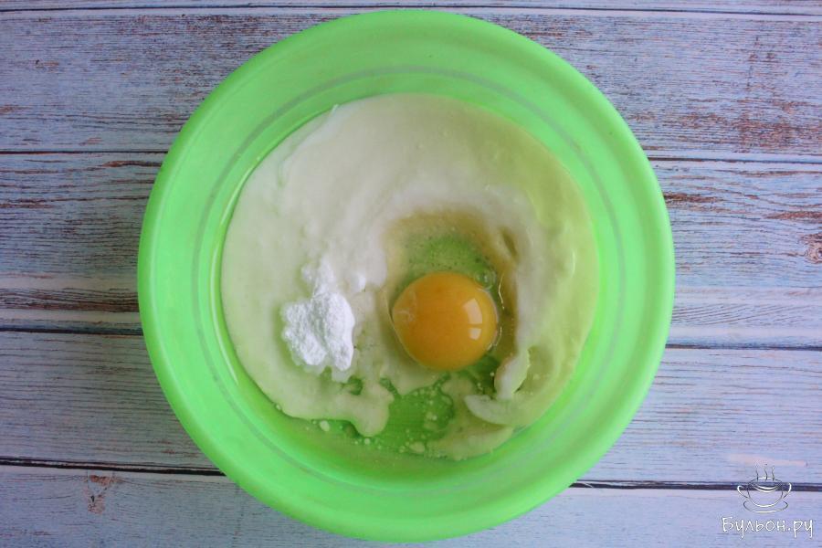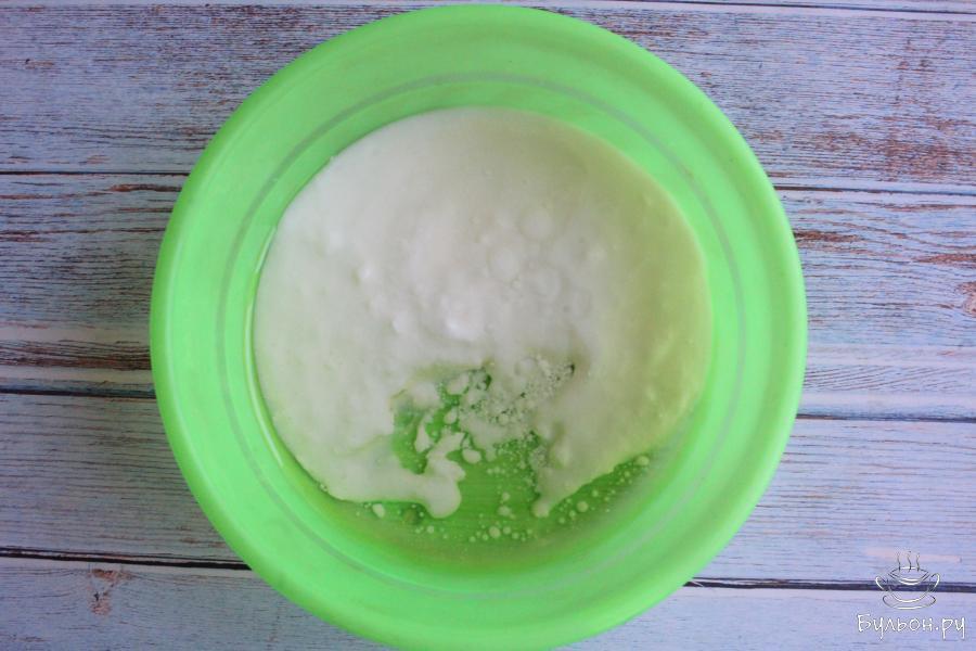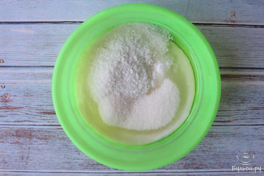 3. Добавляем к кефиру стакан сахара, ванильный сахар и кокосовую стружку. Перемешиваем смесь до растворения сахара. Оставшийся сахар у нас пойдет в сироп.