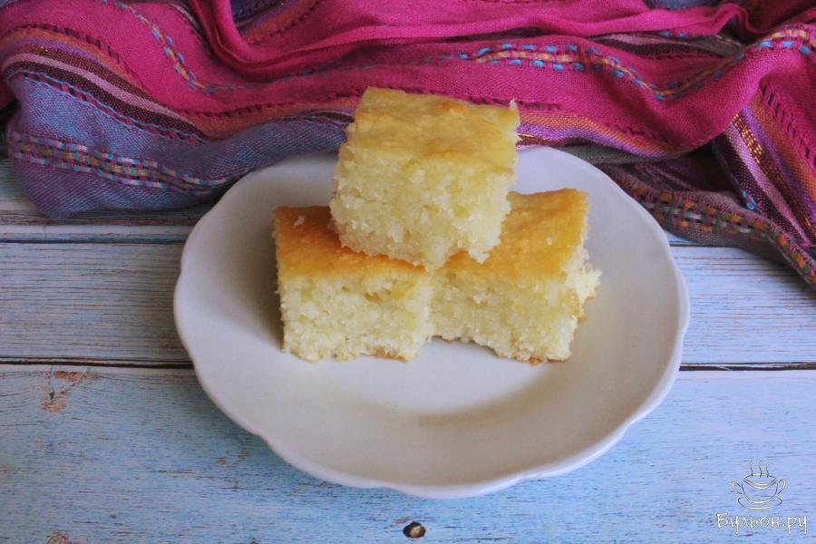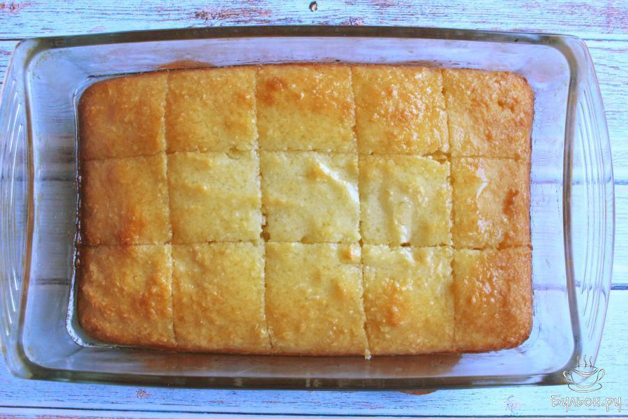 7. Готовый пирог немного остужаем, в форме разрежем его на квадраты. Пропитываем Басбусу сахарным сиропом. Стараемся, чтобы сироп попадал в разрезы.