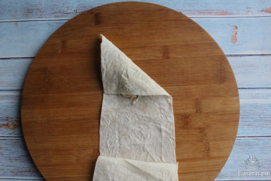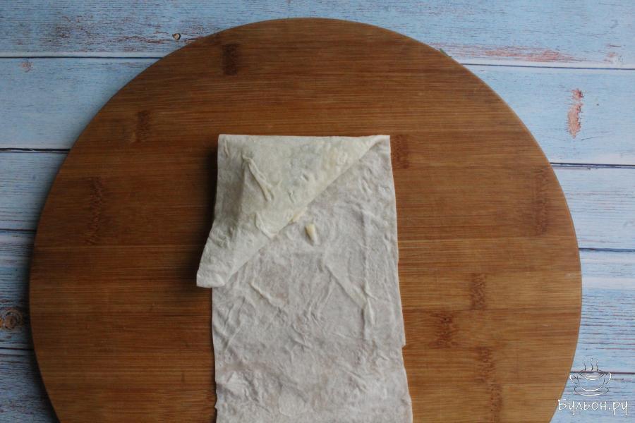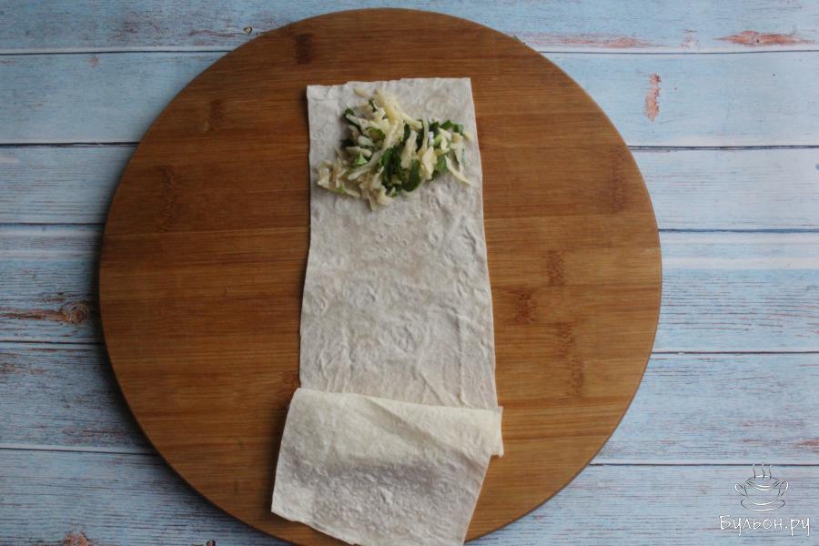 3. Лаваш нарежем на длинные полосы. Ширину полос делаем около 15-ти см. Выкладываем на край плосы 1-2 ст. л. начинки.