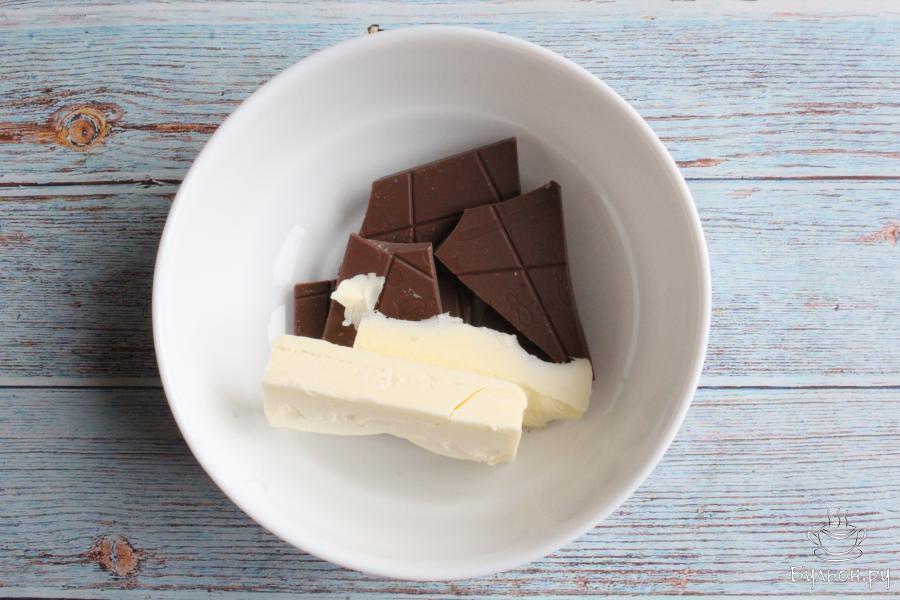 1. Шоколад ломаем на кусочки, добавляем к нему сливочное масло. Растопим смесь до жидкого состояния, либо на водяной бане, либо на очень медленном огне, постоянно помешивая. Шоколад можно взять по вкусу, горький или молочный.
