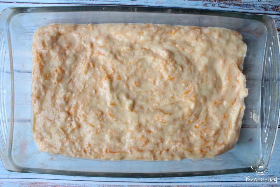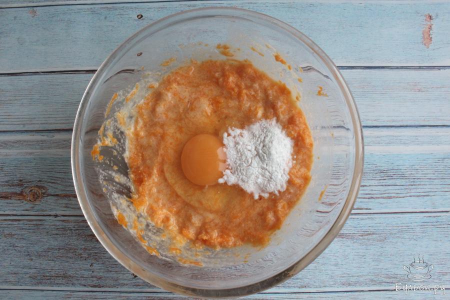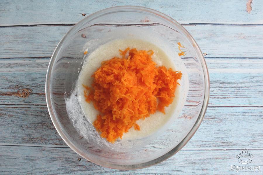 4. В это время тыкву очистить от кожуры и семян. Перетираем тыкву через мелкую терку и добавляем ее в тесто. Перемешиваем.