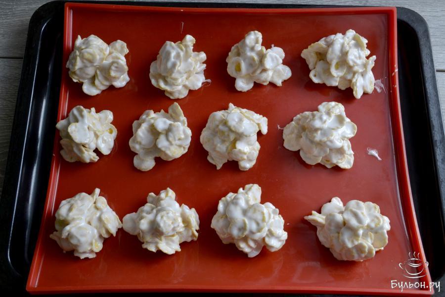 7. Ложкой положите подготовленное "тесто" небольшими кучками на силиконовый коврик или пекарскую бумагу.