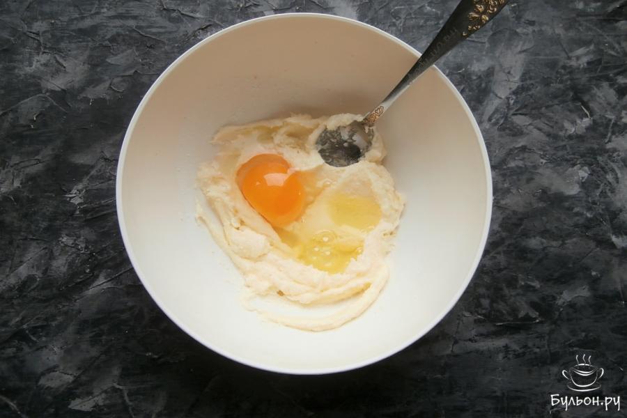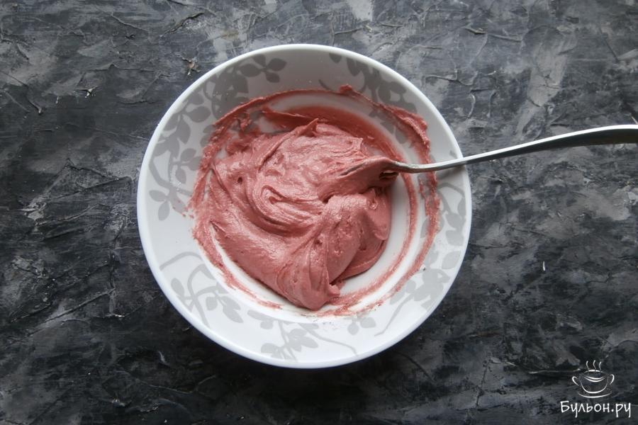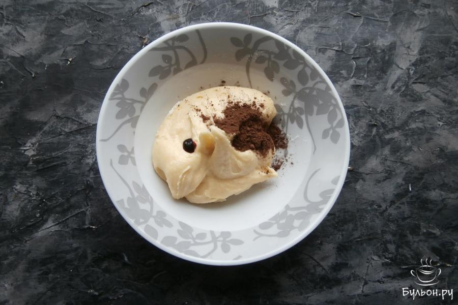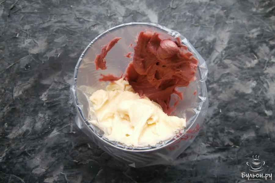 4. Венчиком замесить тесто, которое будет похоже на густой крем. Разделить тесто на 2 части, одну оставить белой, в другую часть добавить 0,5 ч. ложки какао-порошка и 1 капельку пищевого красителя (красного, бордового или малинового).