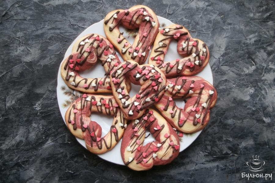Домашнее печенье, приготовленное в виде сердечек можно испечь ко Дню влюбленных и порадовать свою половинку или тех, кто вам очень дорог. Простое, но очень вкусное, красивое печенье сможет приготовить даже новичок в кулинарном деле. Украсить это печенье можно по своему, я сделала зигзаги из темного шоколада и посыпала печенье кондитерской посыпкой в виде сердечек. Можно это печенье просто посыпать сахарной пудрой. В любом случае, приготовленная вашими руками выпечка обязательно понравится тем, кому она предназначена.
