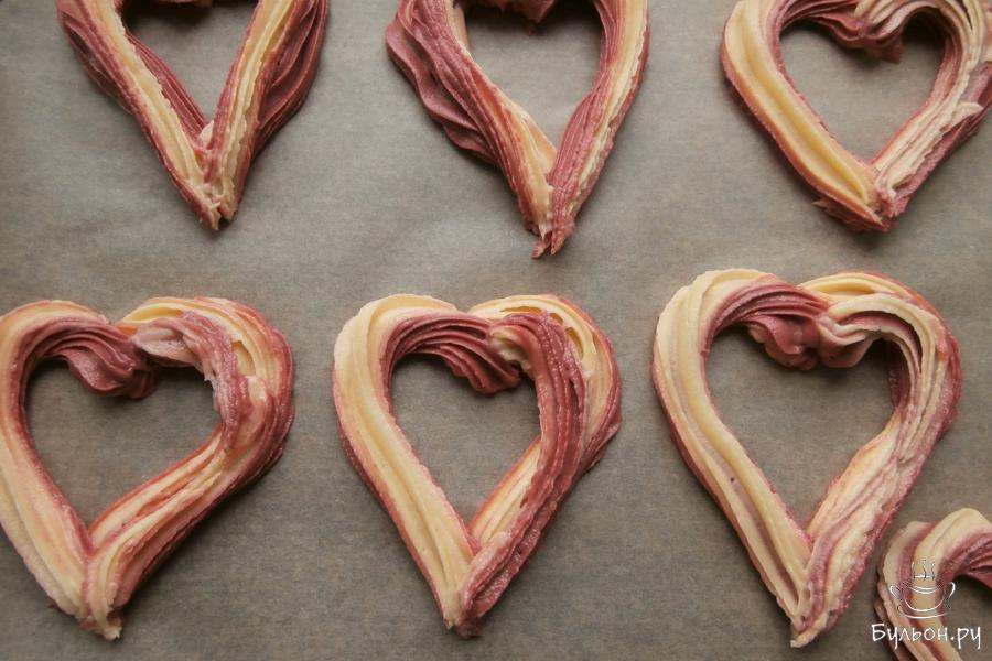 6. В кондитерский мешочек выложить тесто - с одной стороны белое, с другой - красное. Насадку использовать любую "звездочку".