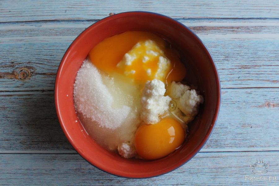 1. Для начинки смешаем творог, сахар, ванильный сахар и яйца. Хорошо перемешаем начинку и отставим в сторону. Пока будем готовить основу для пирога, сахар в начинке растает. Если яйца мелкие, то можно взять 4 штуки.