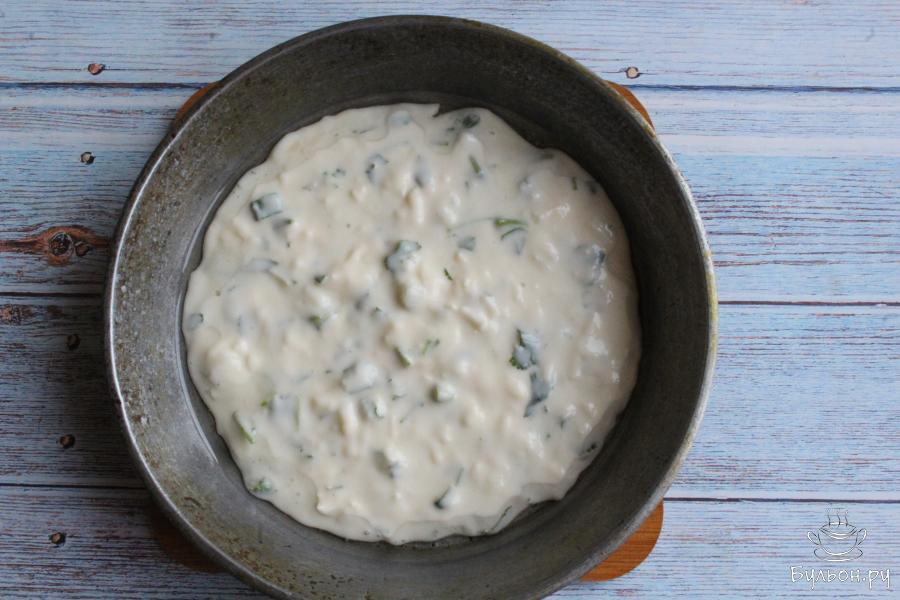 5. Зеленый лук почистим. Далее лук, укроп, кинзу промоем, обсушим и мелко нарежем. Добавим измельченную зелень в тесто и перемешаем.
