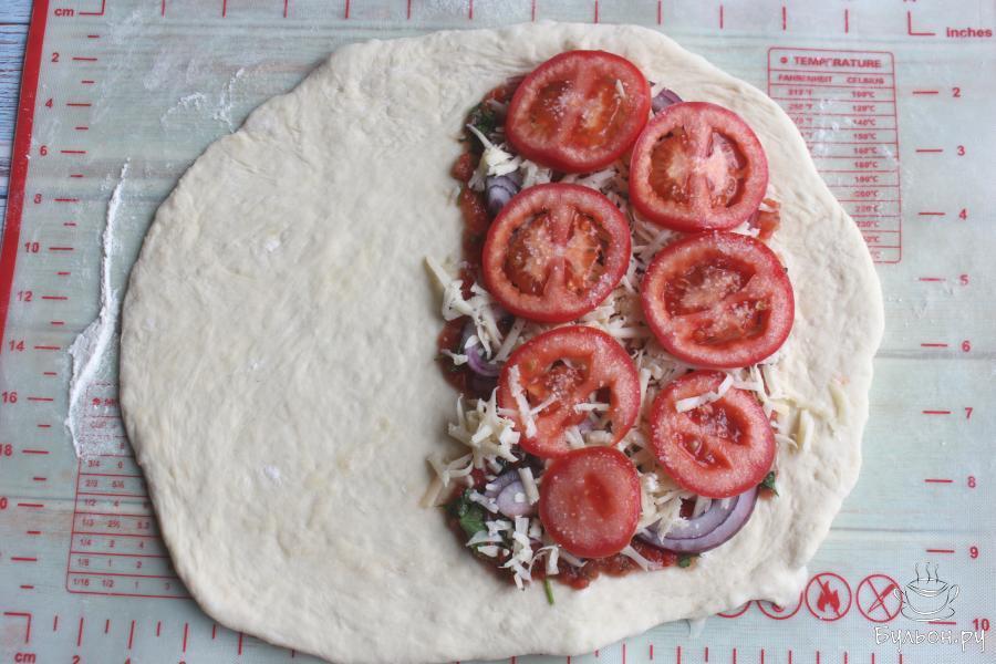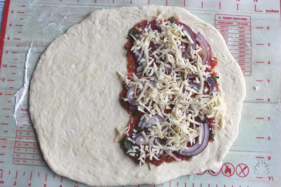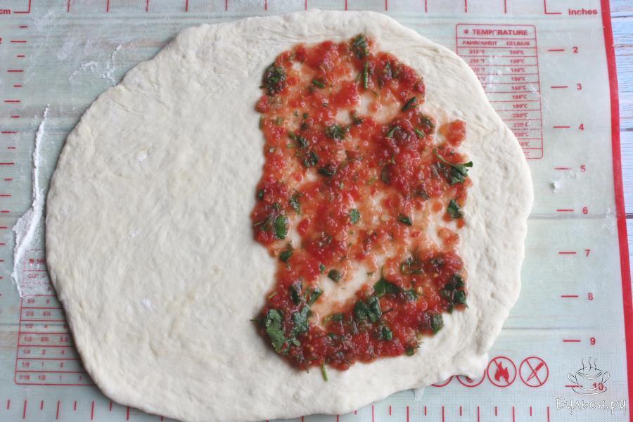 16. Смазываем пиццу оставшимся томатным соусом. Духовку разогреваем до 180 градусов и выпекаем пиццу 35-40 минут.