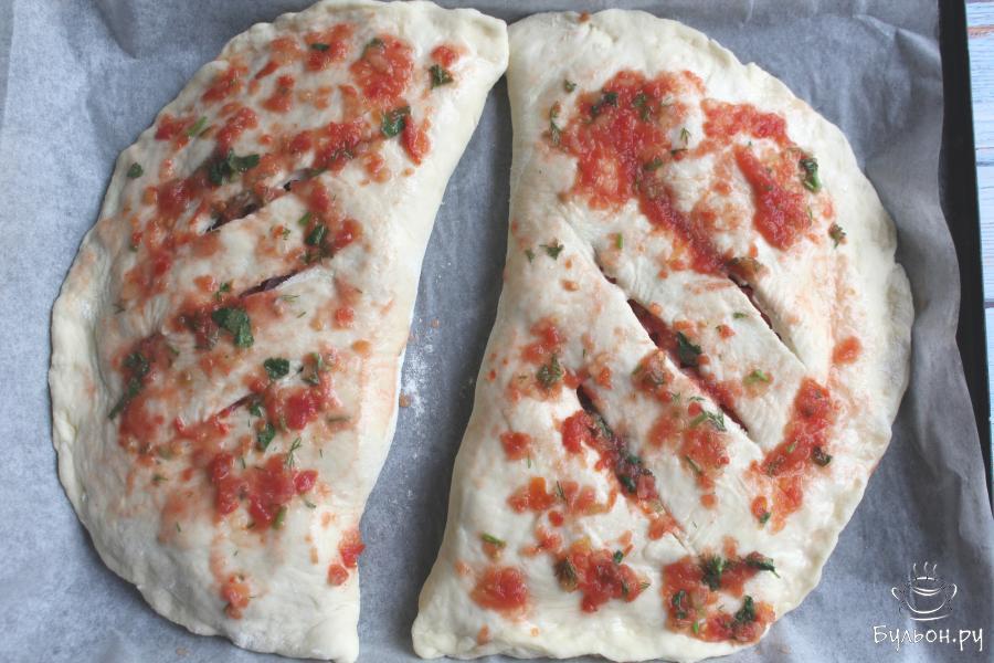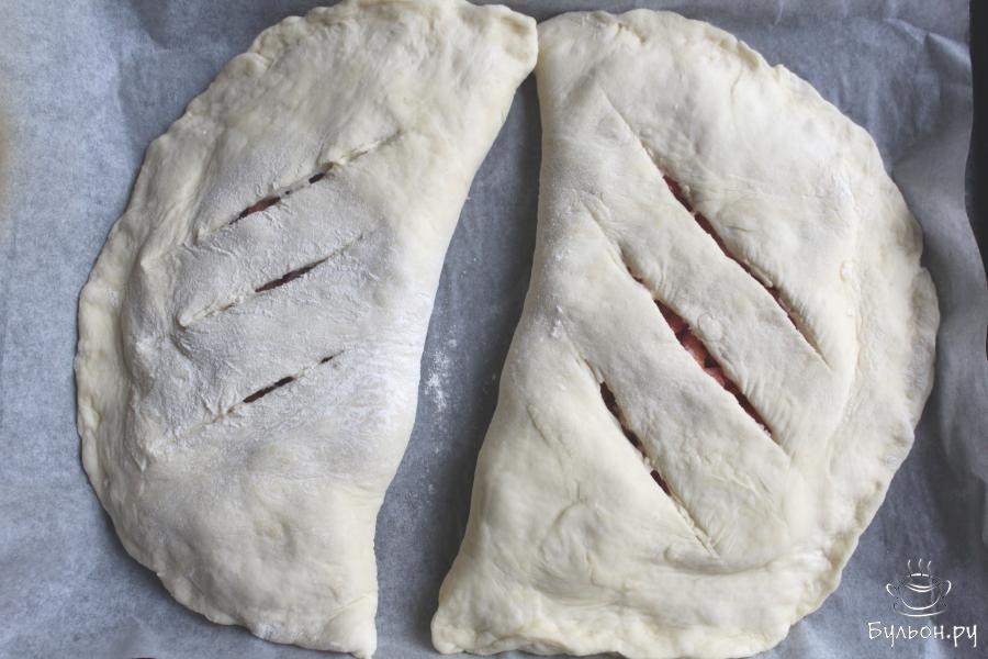 15. Закрываем начинку краем теста и защипываем. Таким образом собираем две пиццы. Делаем на пиццах по три надреза ножом и укладываем пиццу на противень застеленный пергаментом.