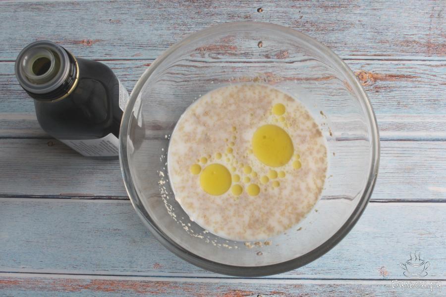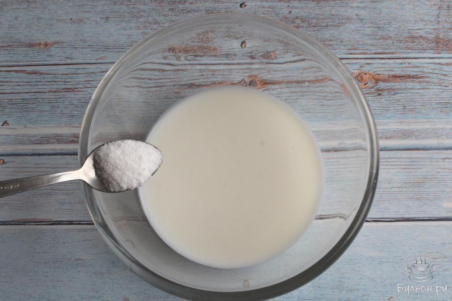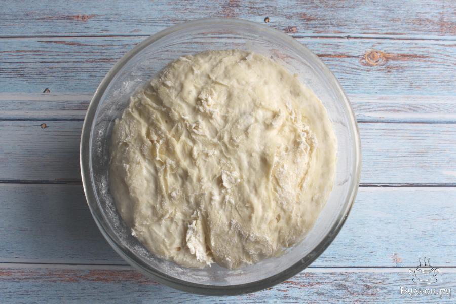 5. Осталось добавить муку и замесить мягкое тесто. Накроем чашку с тестом полотенцем или пленкой и уберем ее на час в теплое место.