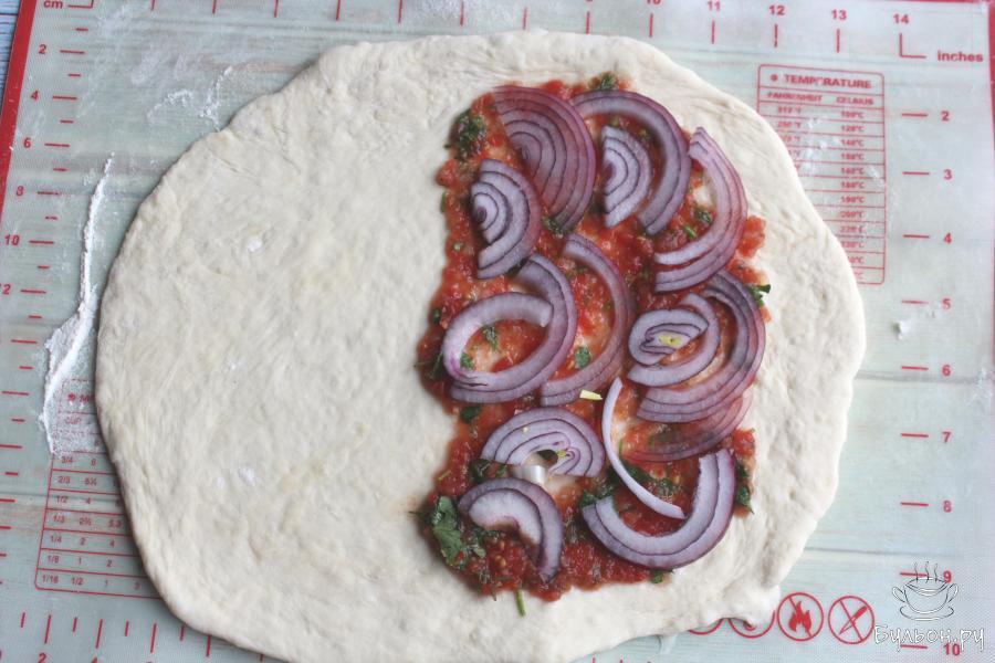 12. Лук чистим, промываем и режем его тонкими кружочками или полукружочками. Выкладываем лук на соус.