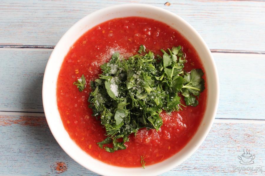 7. Зелень промоем, обсушим и мелко нарежем. К томатам добавим нарезанную зелень и 0,5 ч. л. соли, перемешаем. По желанию в соус можно добавить острый перец, орегано или другие любимые ароматные пряности.
