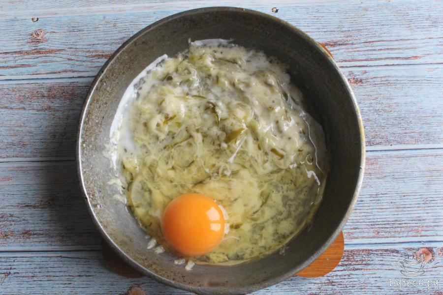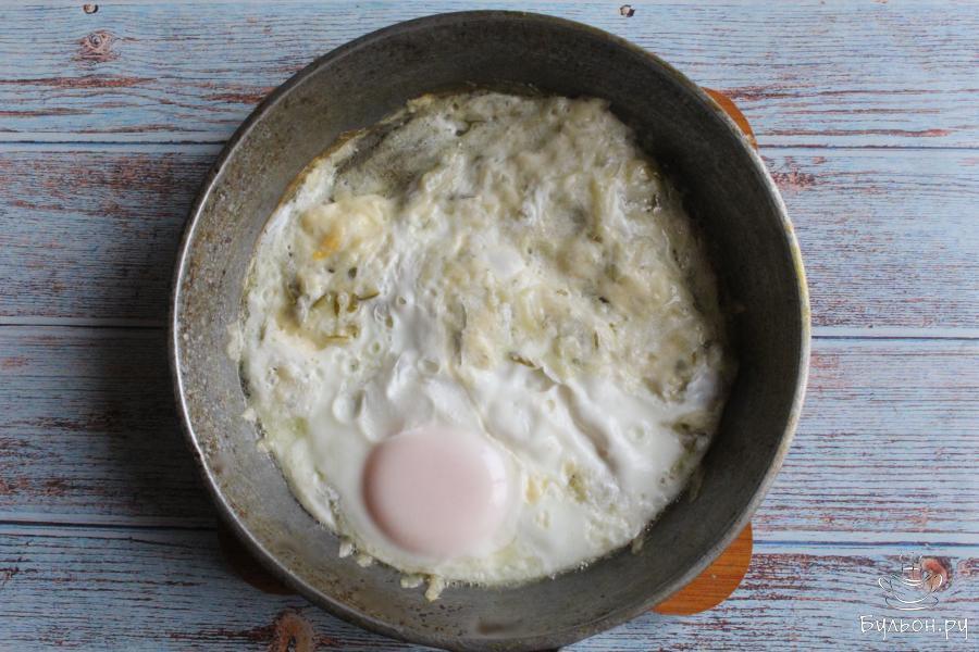 3. Вбиваем к овощам яйца. Тут можно поступить несколькими способами: отделить белки от желтков, белками залить огурцы с сыром, перемешать, а потом уже выложить желтки. Можно вбить яйца и все перемешать. Можно вбить яйца на огурцы с сыром и готовить как обычную глазунью.