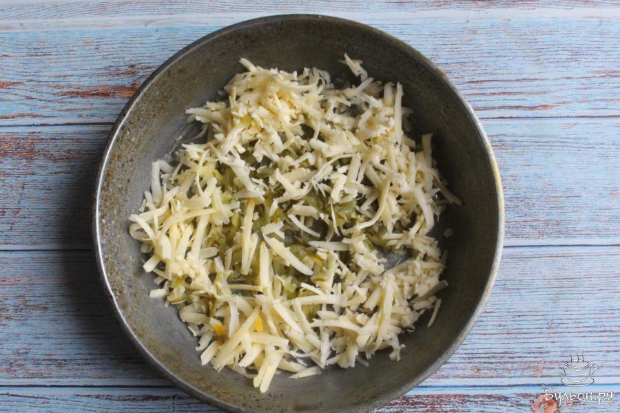 2. Сыр перетираем через крупную терку, добавляем его к огурцам. Ставим сковороду не небольшой огонь и тушим огурцы с сыром несколько минут, постоянно помешиваем.